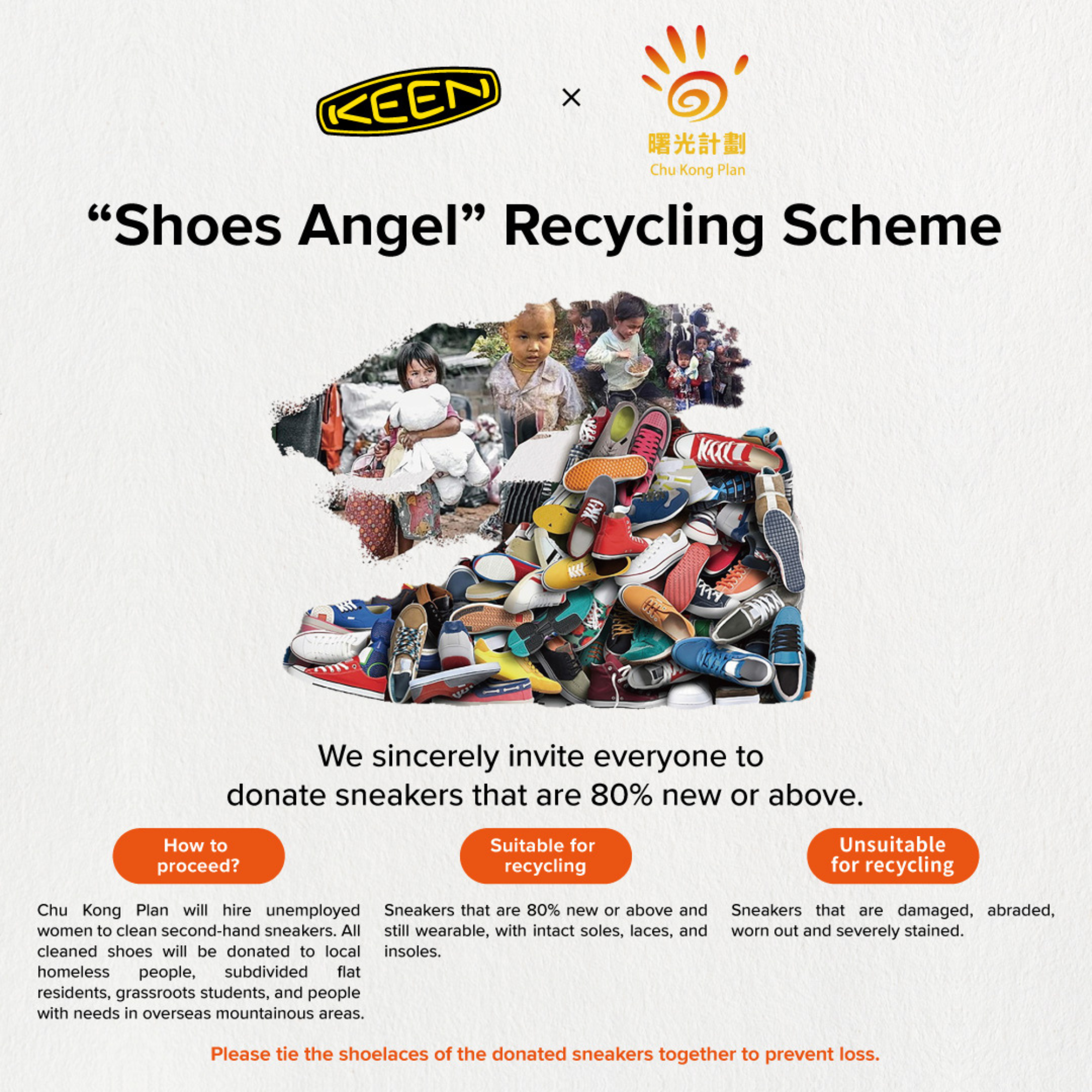 You can donate your sneakers that no longer wear to two KEEN stores. Chu Kong Plan only accept the sneakers that are 80% new or above and still wearable, with intact soles, laces, and insoles. Sneakers that are damaged, abraded, worn out, or severely stained will not be accepted.