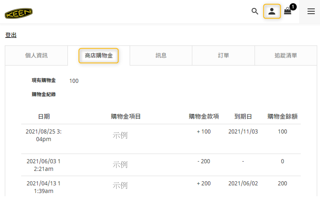 在商店購物金的頁面,會紀錄購物金的收到及使用項目,包含增加方式、過期扣除、以及購物金使用在哪些訂單中。