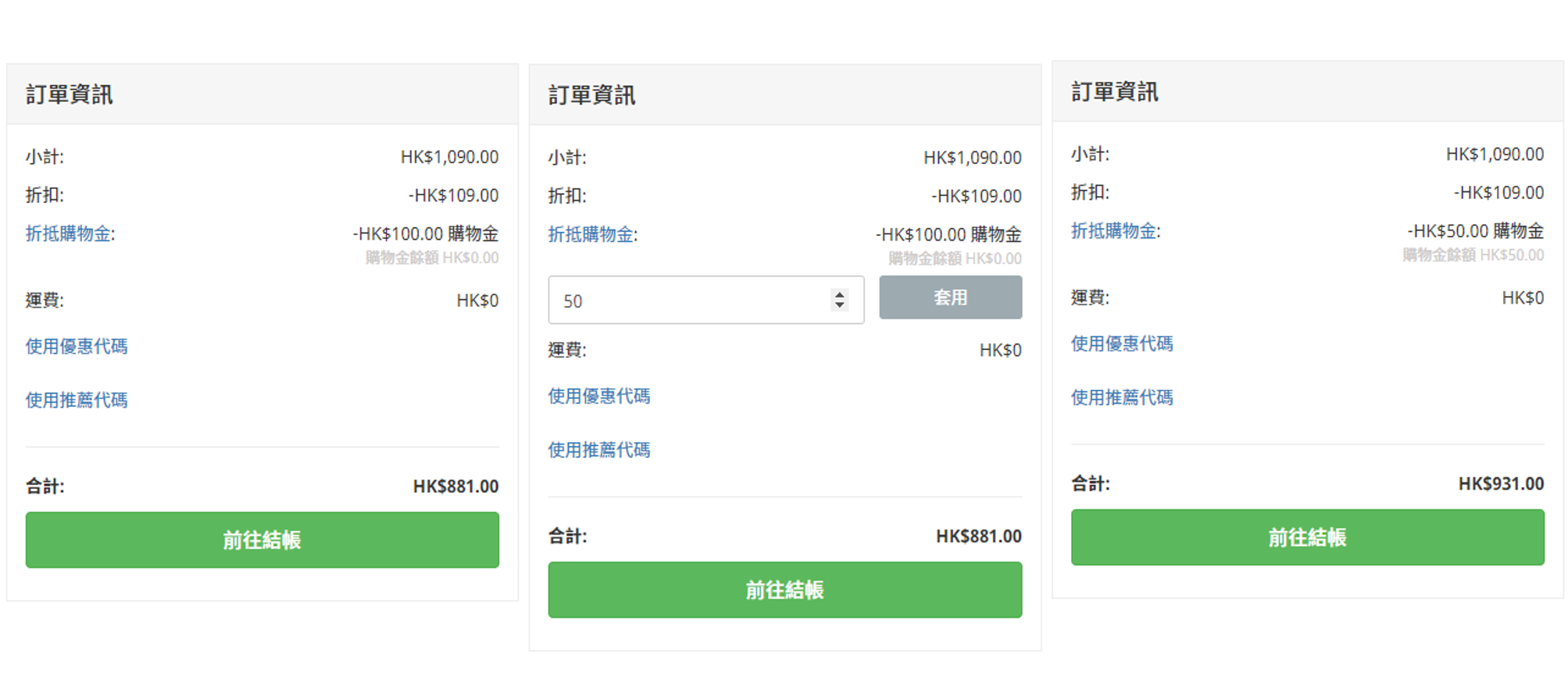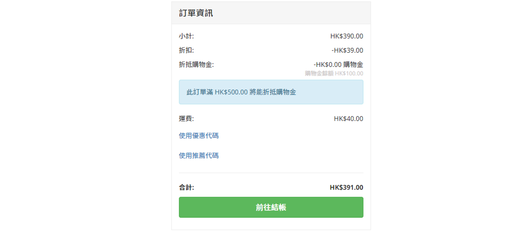 在結帳頁面中,可於「訂單資訊」檢視訂單金額及折扣,當扣除折扣後額滿 HK$500 即可使用商店購物金,系統將自動套用。
