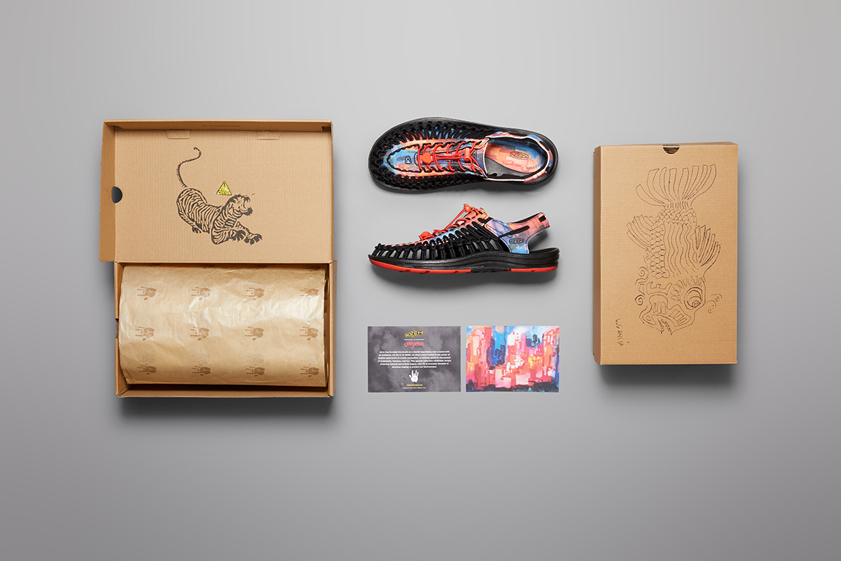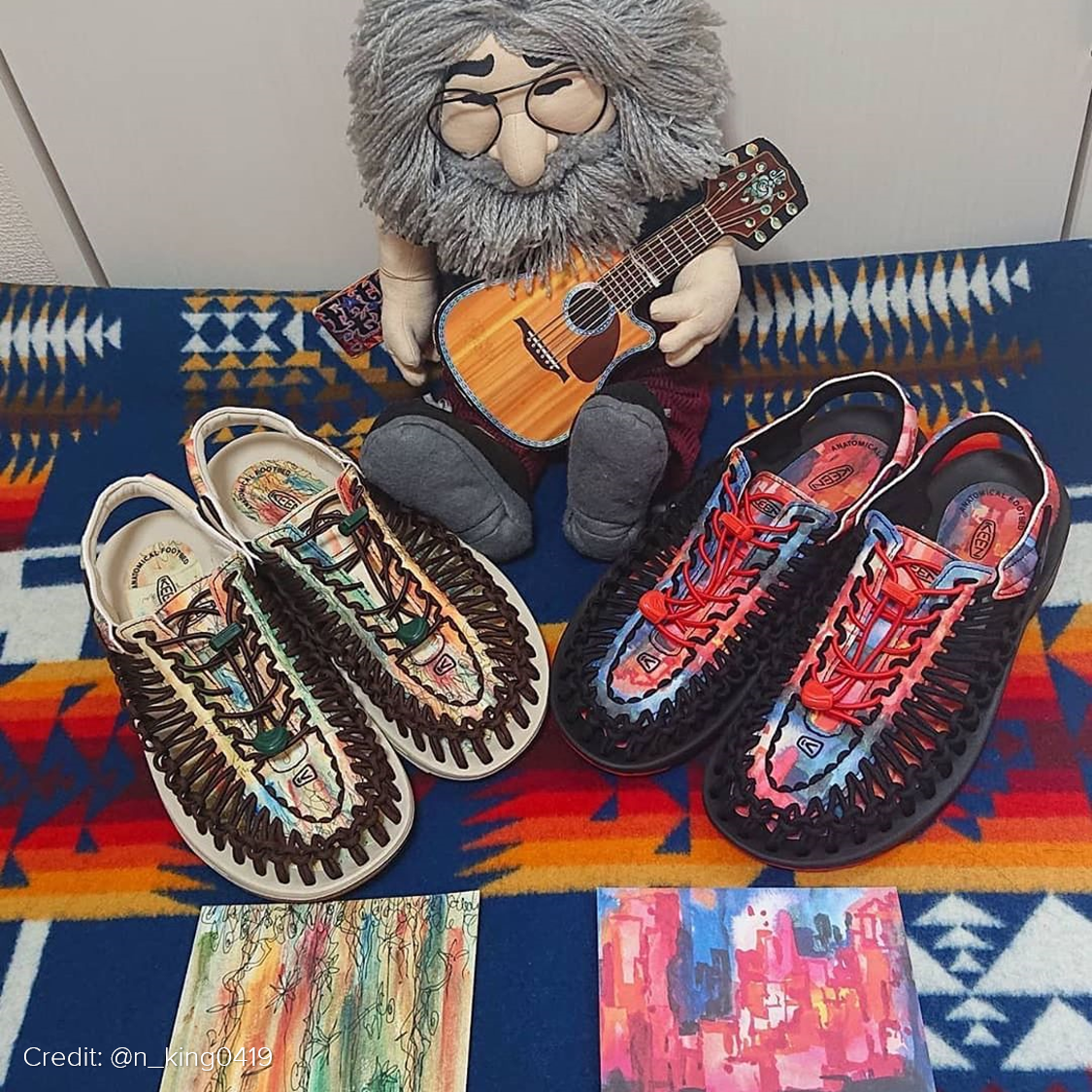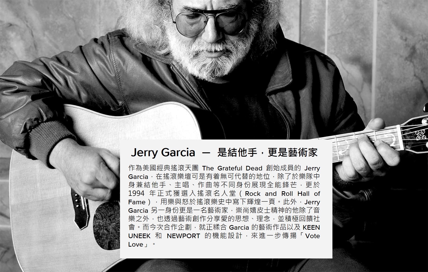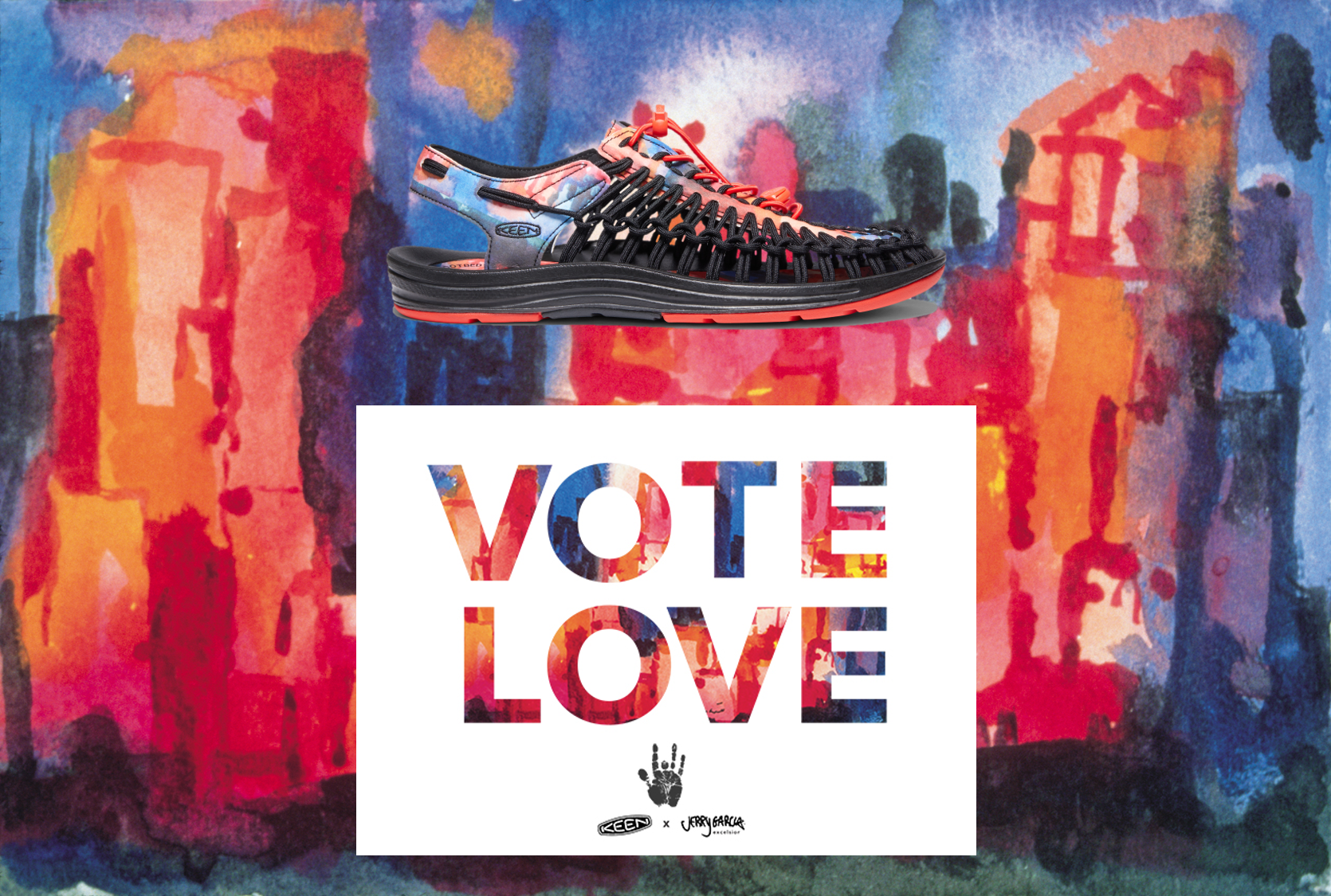 KEEN 跟 Jerry Garcia Family 合作,以美國傳奇音樂人 Jerry Garcia 的藝術作品《New York At Night》及《 Banyan Tree》作為藍本,讓抽象的色彩幻化成 UNEEK 及 NEWPORT H2 的鞋面設計,鞋盒上更別出心裁地綴上 Garcia 的畫作《Fish》及他生前鍾愛的吉他「Tiger」的圖案,呈獻上 KEEN x Garcia 聯乘系列,並以「VOTE LOVE」作口號,希望能在困難重重的當下,以愛將大家聯繫在一起,積極為社會帶來正面的改變!