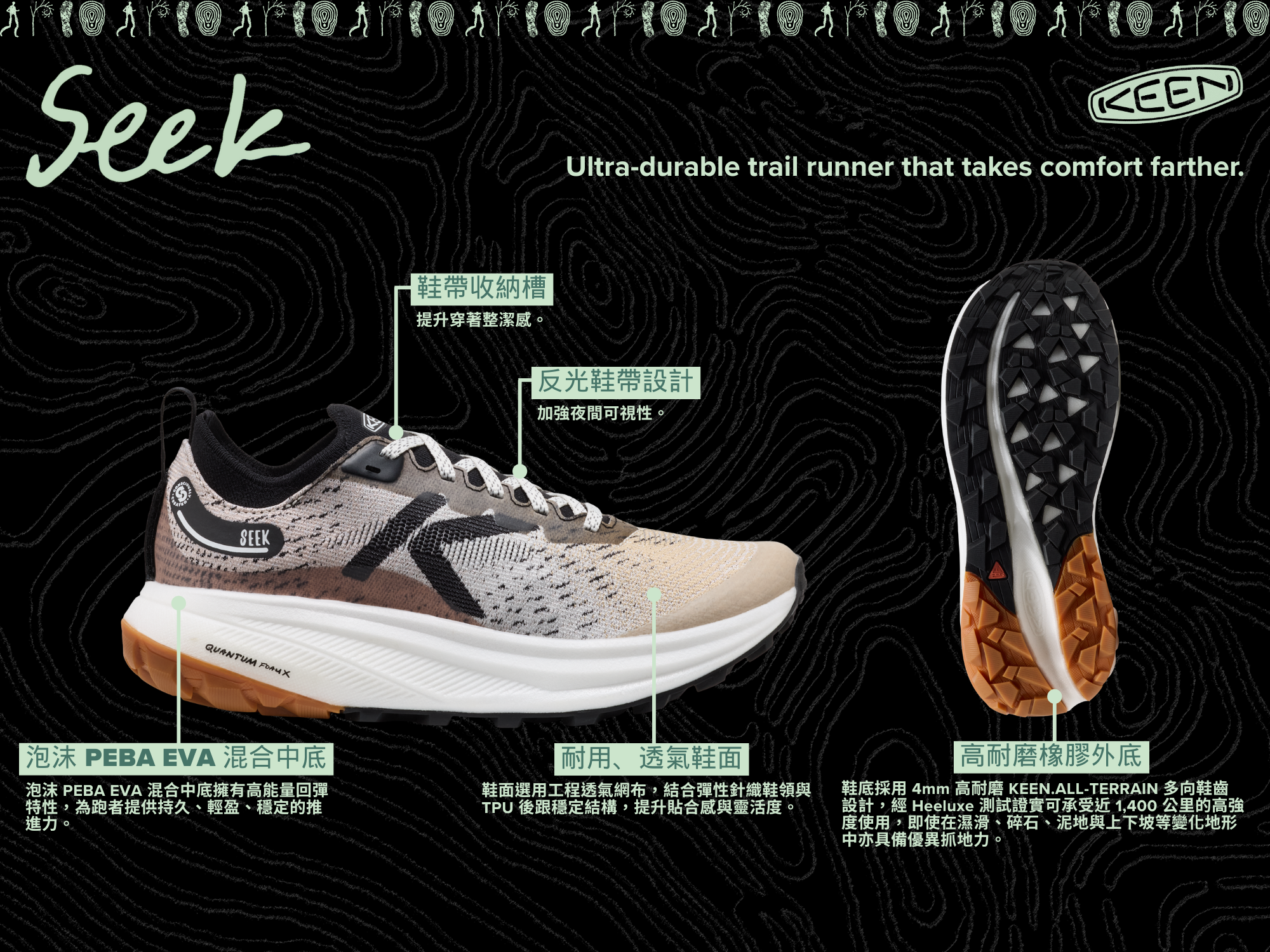 KEEN 憑藉 22 年深厚戶外裝備設計經驗,正式推出品牌首對越野跑鞋 SEEK,進軍越野跑市場。SEEK 集創新科技、真實使用者測試與人體工學設計之大成,為越野跑者帶來兼具舒適性、穩定性與功能性的專業裝備,與你穩跑山野,征服多變地形。