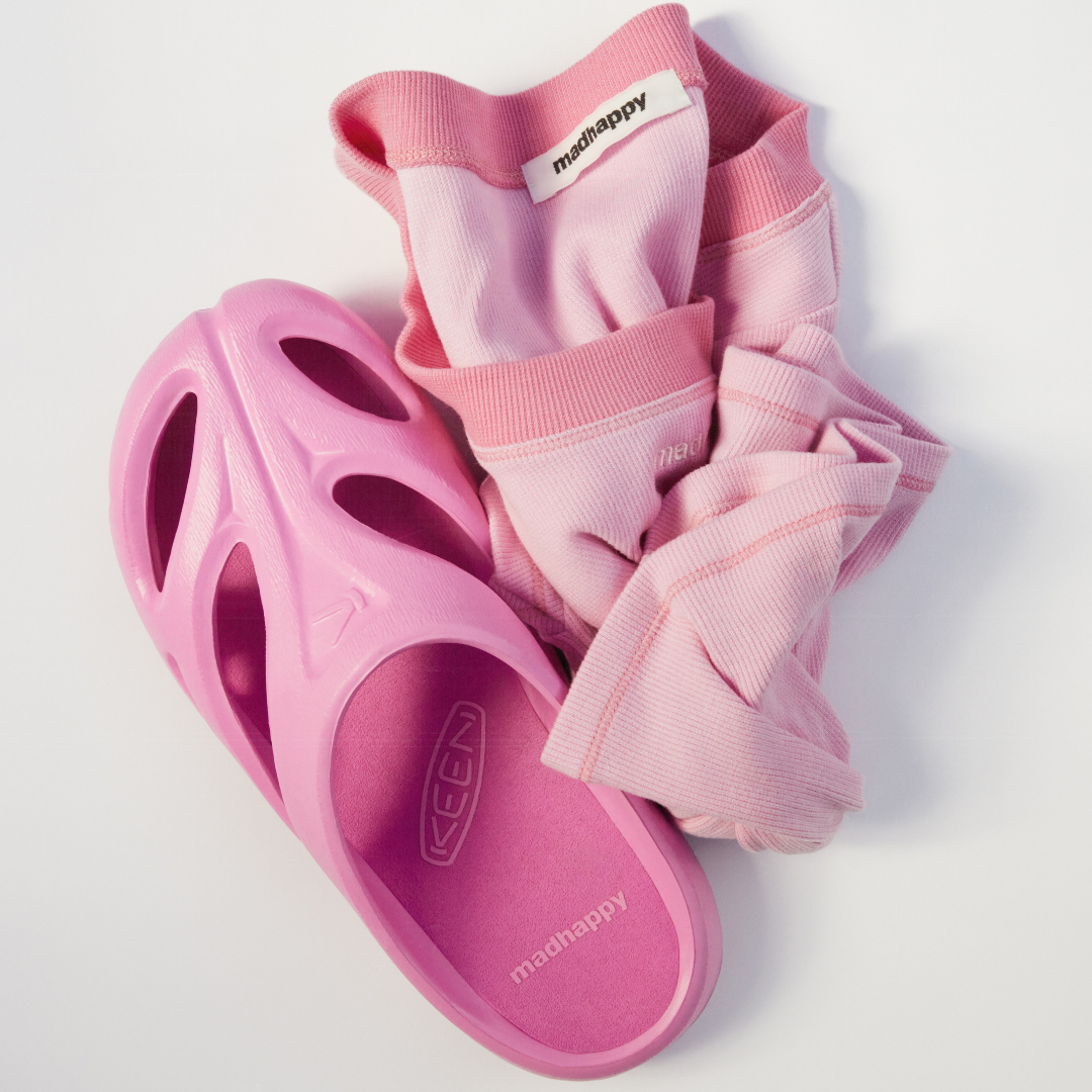 KEEN 與洛杉磯服裝品牌 Madhappy 聯手,透過透氣舒適、極輕盈的 SHANTI 拖鞋款式推廣保持樂觀構想。SHANTI 譯作「和平」,而 Madhappy 則以充滿樂觀希望、注重心理健康的心態打造服裝,因此這一次合作旨在向大眾傳播積極氛圍的訊息。