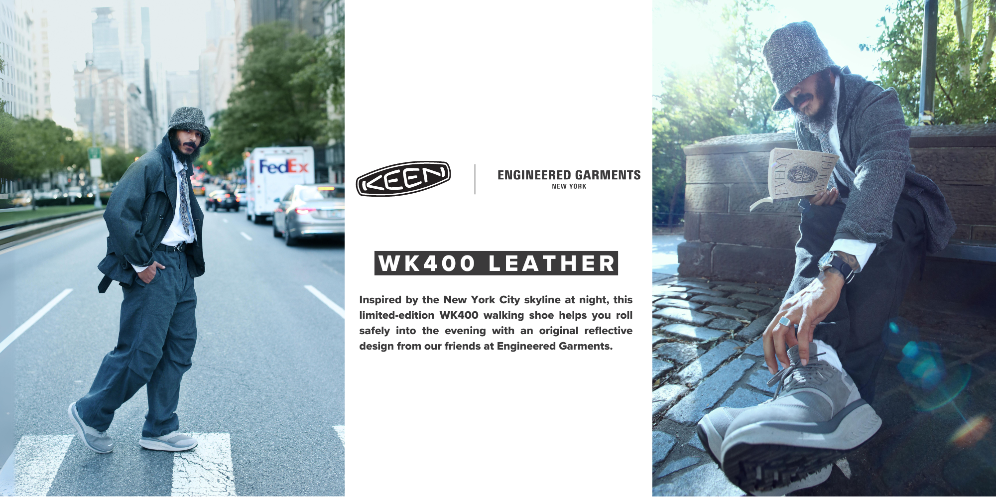 今次聯乘款設計跳出既有框框,選用高級優質皮革為聯乘重點,盡顯 Engineered Garments 經典的工裝魅力。左右兩邊的鞋面採用不同材質的皮革,以光亮啞面皮革拼絨面皮革,沉穩中帶出玩味感覺。 在功能方面, WK400 LEATHER 應用 KEEN 研發多年的創新獨家 KEEN.CURVE™ 技術,透過平衡穩定板技術、中底緩衝及恆定曲線等具機能性的弧形設計,能夠提供腳趾到腳踭的持恆曲線,讓腳跟觸地到腳趾離地間轉換,在走路時不斷推進,令到成個動作更流暢、更慳力,隨意讓你在都市之間輕鬆穿梭遊走。