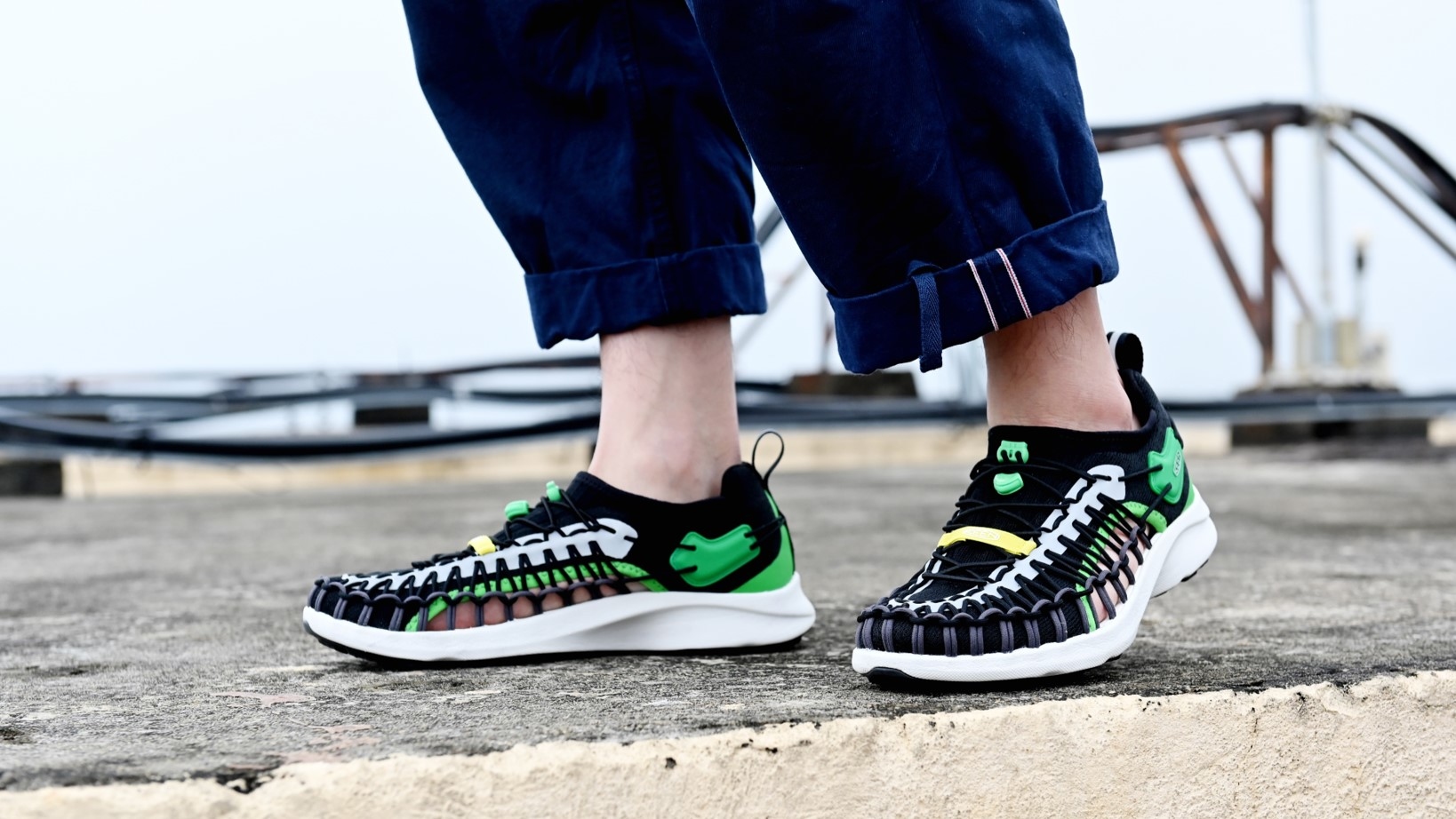 以黑色撞螢光綠與黃 ,鞋面加入銀色反光元素,呈現出豐富的漸層感 ,強烈的視覺衝擊絕對是夏日首選配色。