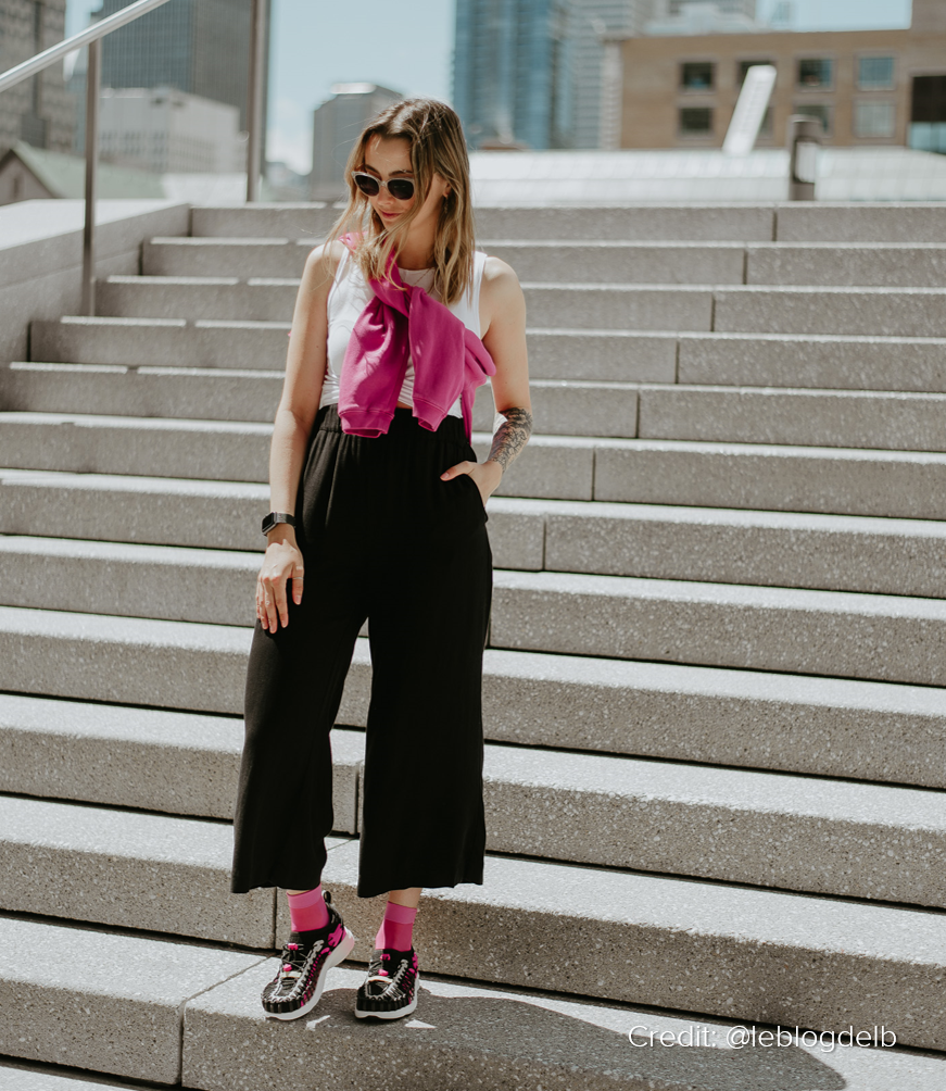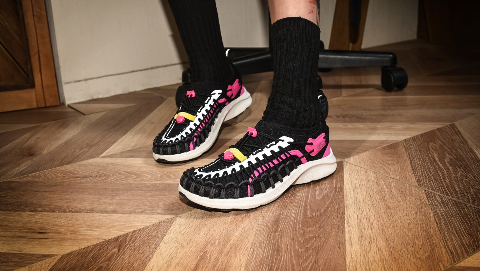鞋側及鞋踭以搶眼的螢光粉紅色勾畫出腳部線條,令腳型在視覺上更為修長。鞋面加入銀色反光元素,型格黑色搭配少女感十足的螢光粉紅色,兩者配色對比強烈,打造型格感之餘亦不失女士的甜美風格。